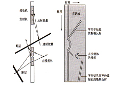 當超聲探頭在斷裂帶反射面的左邊(上)部時,對斷裂帶上部分成圖。當超聲探頭到達反射面的右邊(下)部時,對斷裂帶下部分成圖。溶洞反射體顯示的圖像為雙曲線圖。